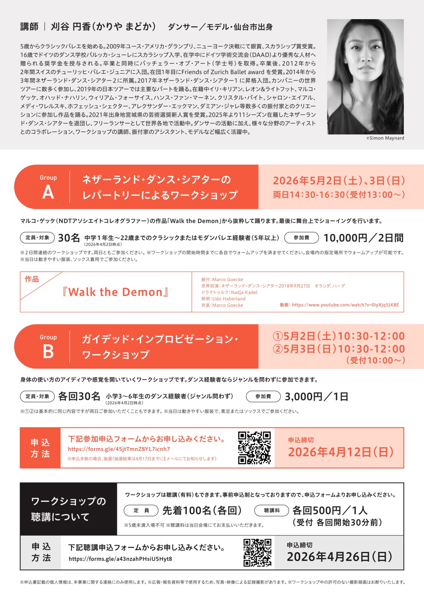 | <Group A> | マルコ・ゲッケ(NDTアソシエイトコレオグラファー)の作品「Walk the Demon」から抜粋して踊ります。最後に舞台上でショーイングを行います。